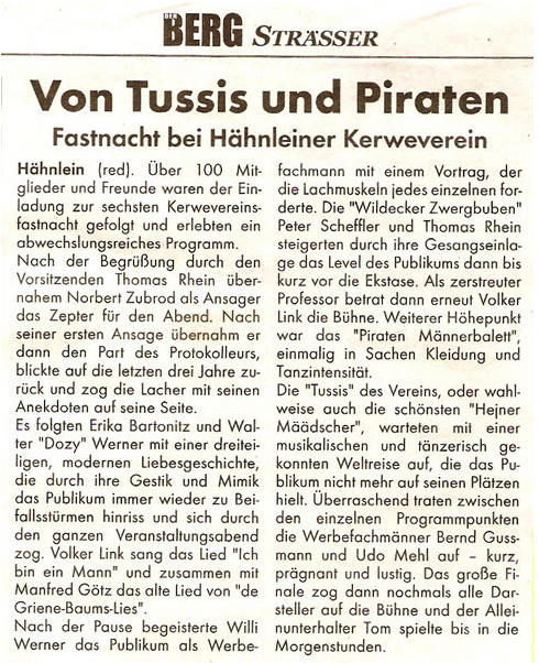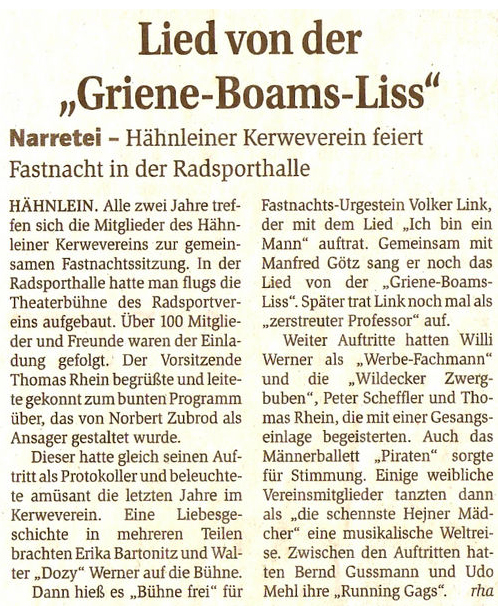 Dies war wieder eine gelungene Veranstaltung. Herzlichen Dank an alle Helfer/Akteure auf und hinter der Bühne. Und vor allem denen, die am nächsten Morgen - nach durchfeierter Nacht - wieder in der Halle bereitstanden, um aufzuräumen und sie wieder ordnungsgemäß dem Radfahrverein zu übergeben.
